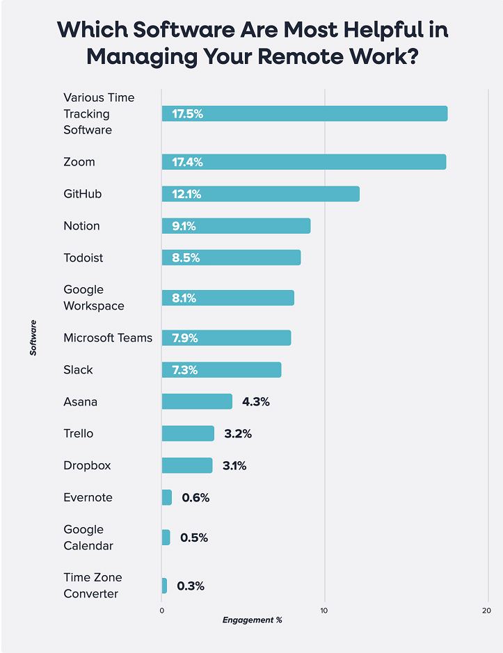 Time tracking software (17.5%) takes the top spot, helping remote workers manage their hours and productivity. Zoom (17.4%) isn’t far behind, continuing to be a go-to for virtual meetings. GitHub (12.1%) is a favourite among developers, while Notion (9.1%) and Todoist (8.5%) help professionals organize tasks and workflows.