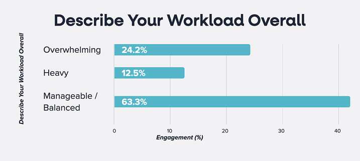 While remote workload differs depending on the profession, the vast majority of our audience (63.3%) describe their workload as manageable. However, only 24.4% call their workload overwhelming, and just 12.5% say it’s heavy.