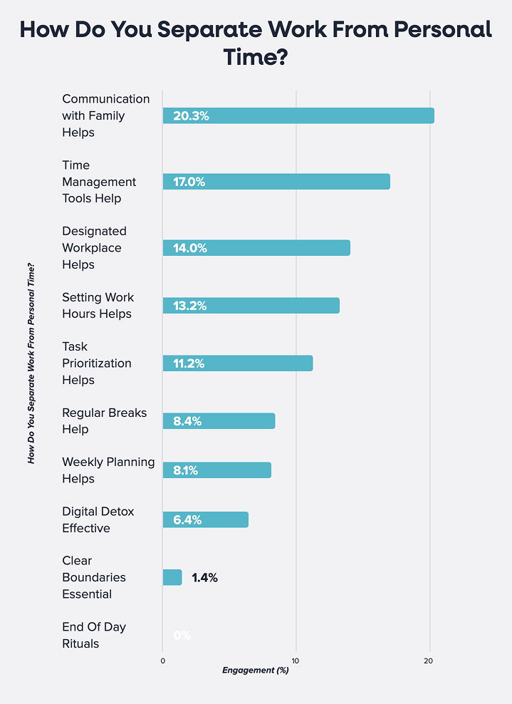 Time management tools (17%) also play a key role, helping workers structure their day efficiently. Similarly, having a designated workspace (14%) makes it easier to mentally switch between work and home life. Setting specific work hours (13.2%) further reinforces boundaries, creating a clear divide between professional and personal time.