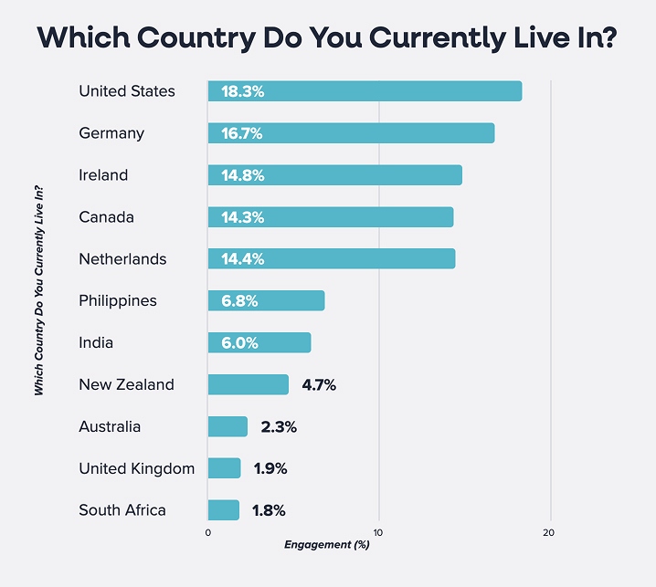 A smaller percentage of respondents live in New Zealand (4.7%), Australia (2.3%), and the United Kingdom (1.9%), suggesting traditional office roles may still be more common in these countries. South Africa (1.8%) rounds out the list, showing that remote work opportunities continue to expand worldwide.